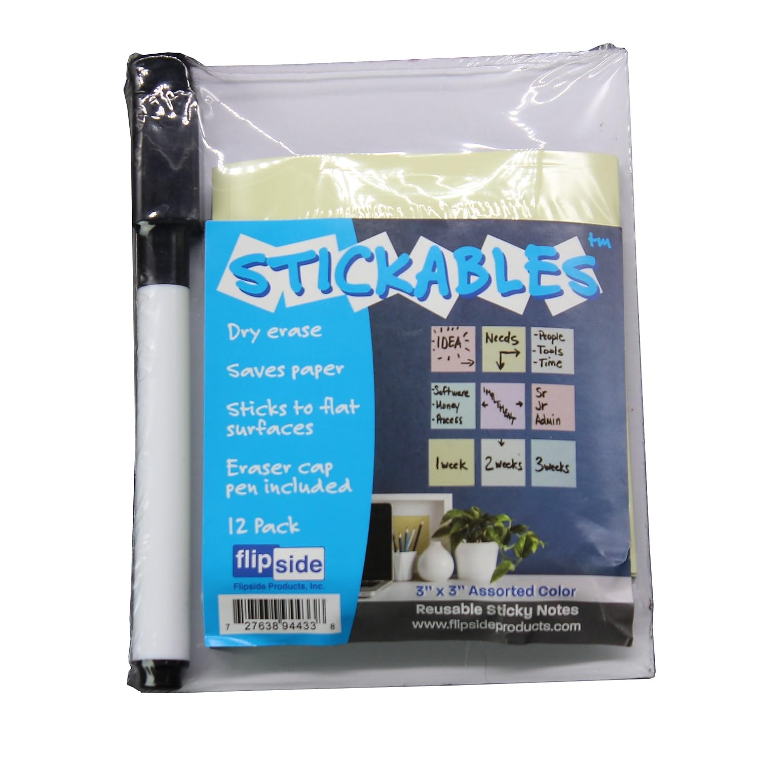 Flipside Products 3" x 3" Pastel Dry Erase Notes w/Black Marker and Eraser Cap, Reusable Sticky Notes, Removeable Desk Dry Erase Sticker, Repositionable, Peel and Stick, White - 2 Packs of 12 Sheetsā